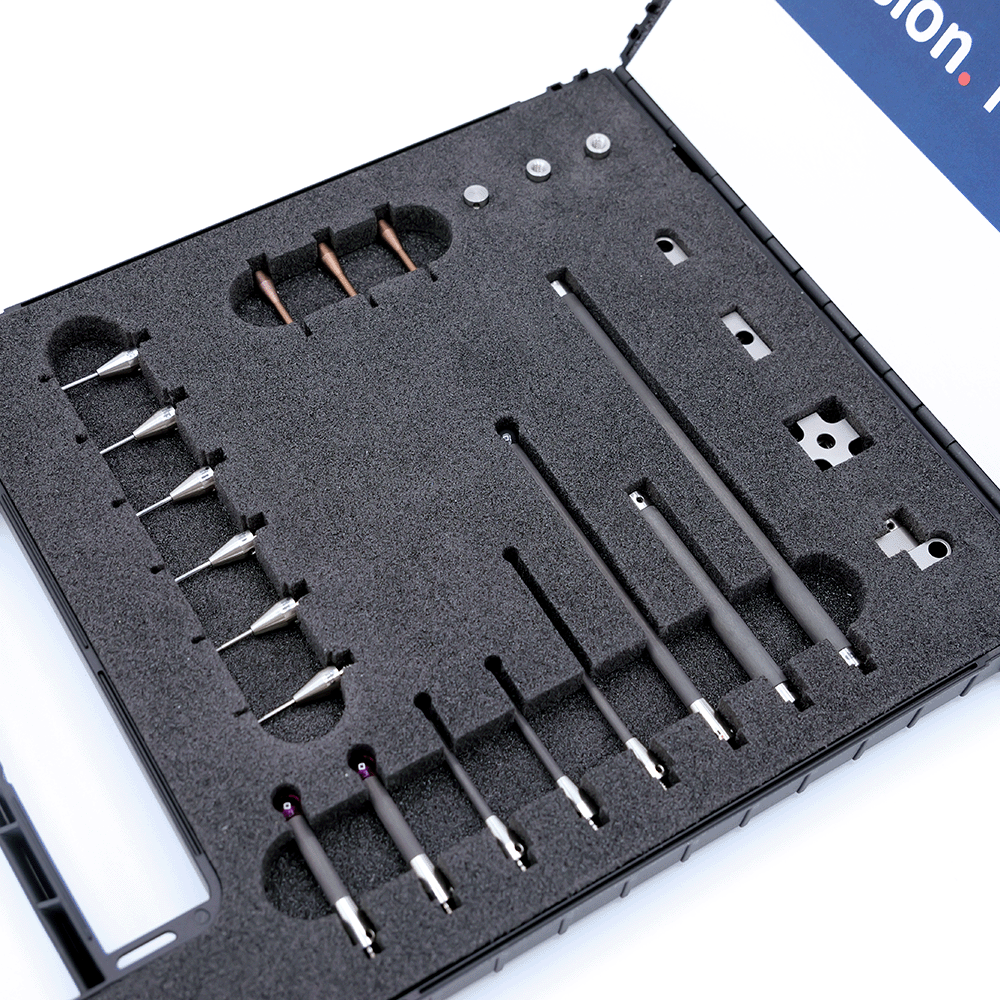 M3 styli set for Zeiss Vast XXT (24 pieces). This large set includes a selection of commonly used probes with ultra-light yet robust carbon fibre stems, as well as trusted carbide stems with ruby and silicon nitride balls. It also includes various components for assembling one- to four-arm star styli, as well as matching pin wrenches.